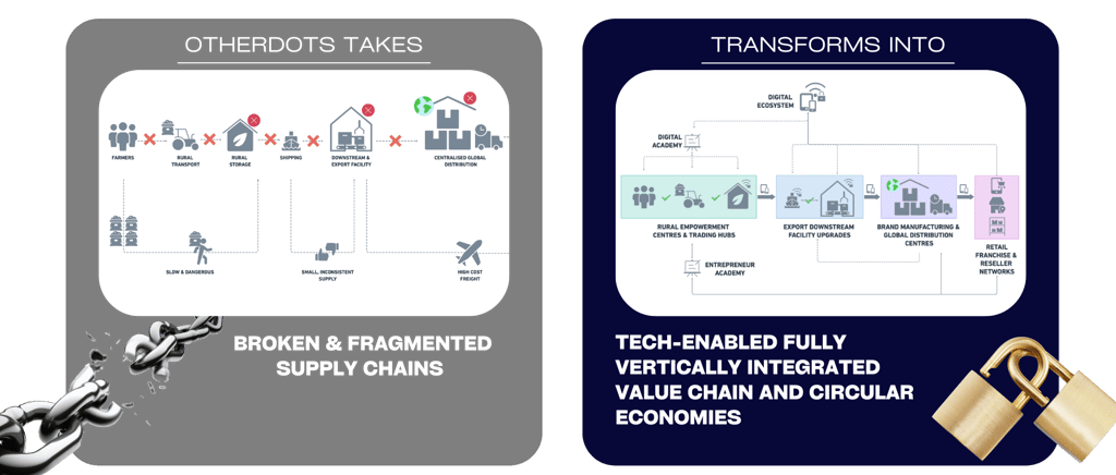 We don’t just work within broken systems, we rebuild them. Otherdots takes fragmented, uncoordinated, and inefficient supply chains and transforms them into streamlined, tech-enabled networks. Through vertical integration and specialised infrastructure, we bring order to chaos unlocking efficiency, transparency, and inclusive growth from the ground up.