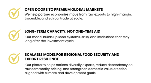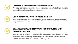 We’re embedding blockchain and AI analytics into our supply chain infrastructure to ensure real-time visibility, smarter land-use decision-making, and verified ethical sourcing from farm to global shelf. This creates transparency, reduces waste and fraud, and helps both buyers and producers gain more value from every transaction.