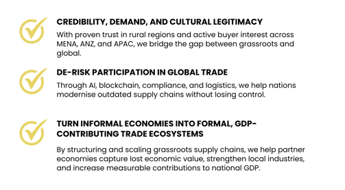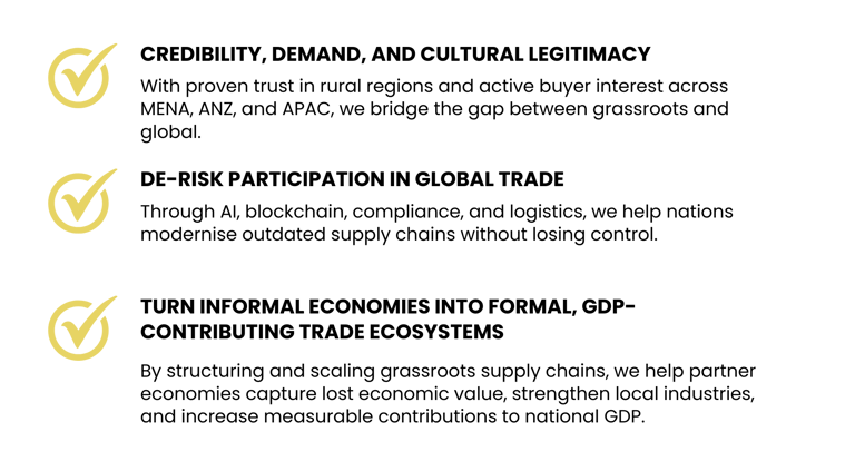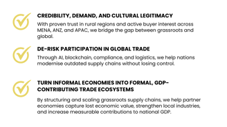 We digitise and de-risk every step of the value chain from Indigenous land and trusted local partnerships to global buyers. Turning disconnected supply chains into scalable, tech-enabled trade ecosystems.
