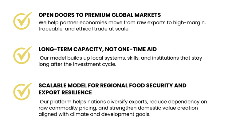 We believe in building mutually beneficial trade relationships through circular economies—shifting the narrative from aid dependency to dignified, inclusive trade.