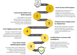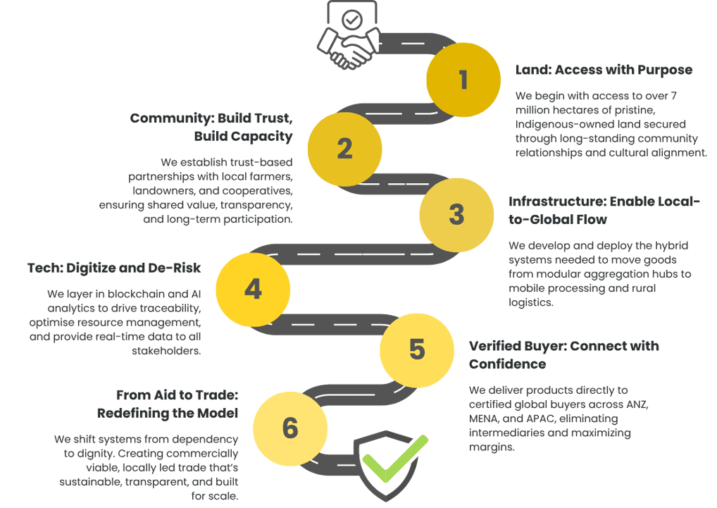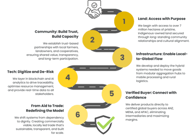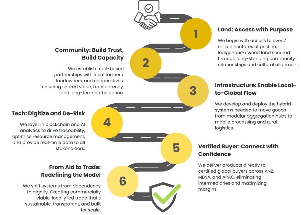We digitise and de-risk every step of the value chain from Indigenous land and trusted local partnerships to global buyers. Turning disconnected supply chains into scalable, tech-enabled trade ecosystems.